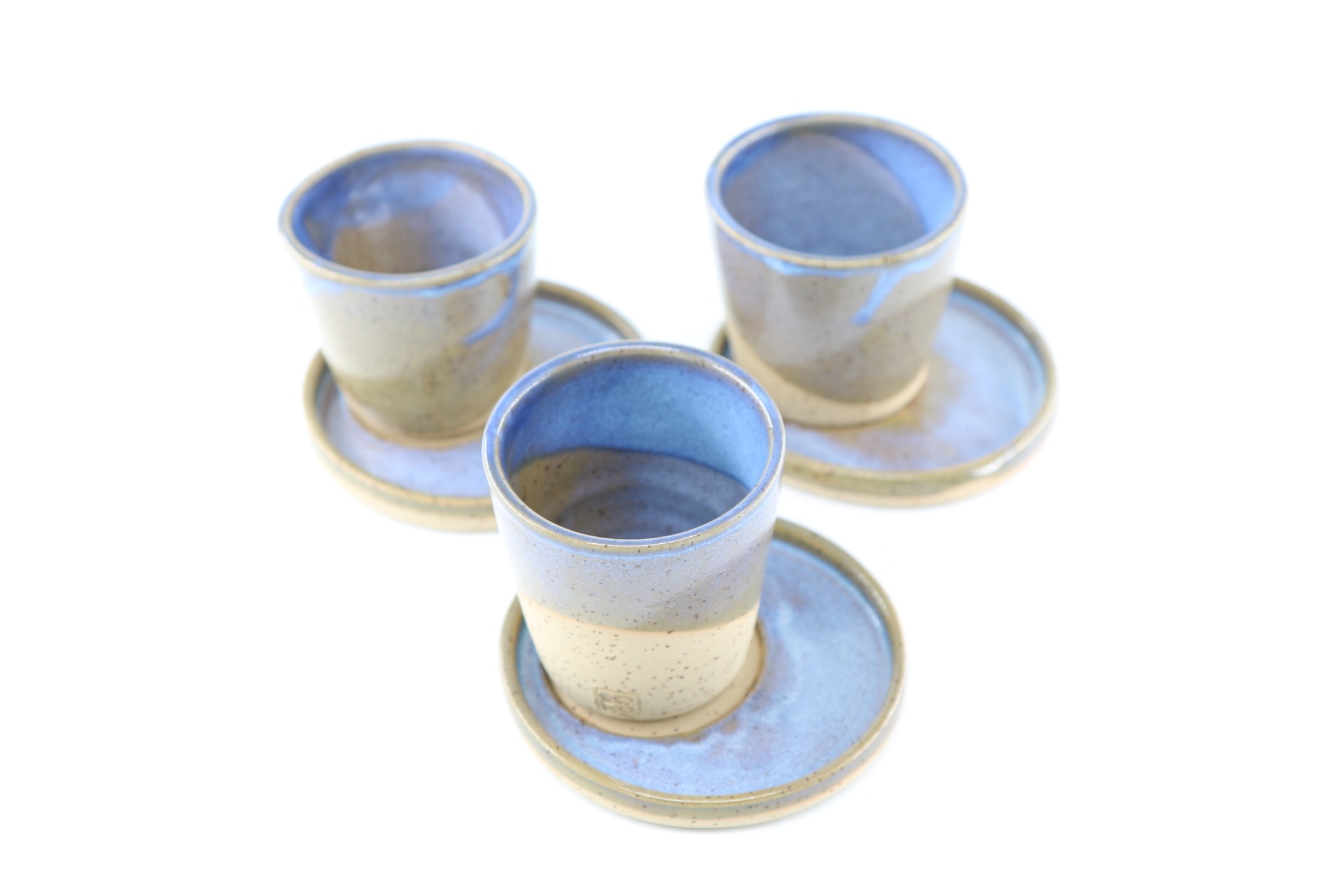 Beker en schoteltje in spikkelklei, voorzien van ons Light Blue Jeans studioglazuur.