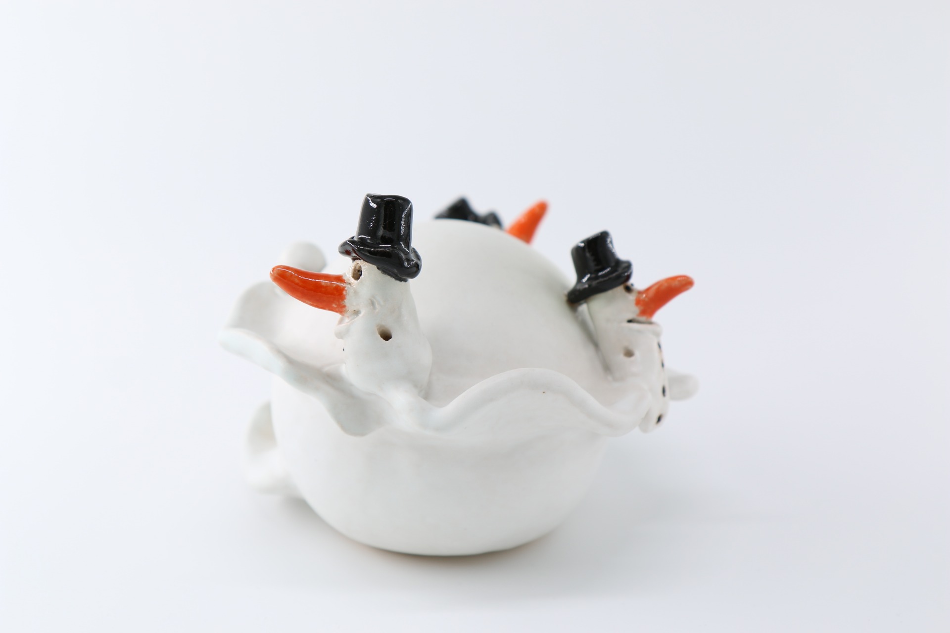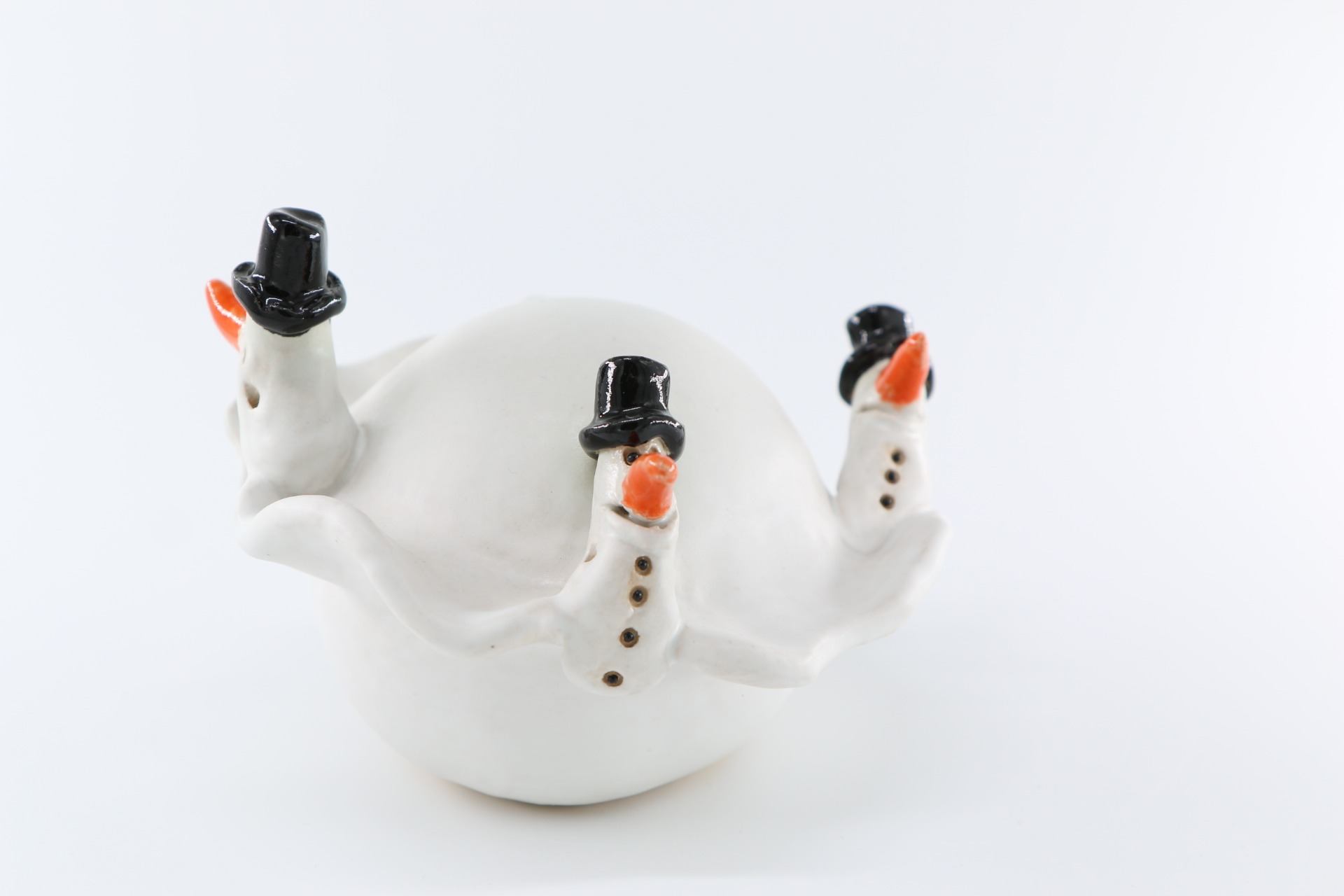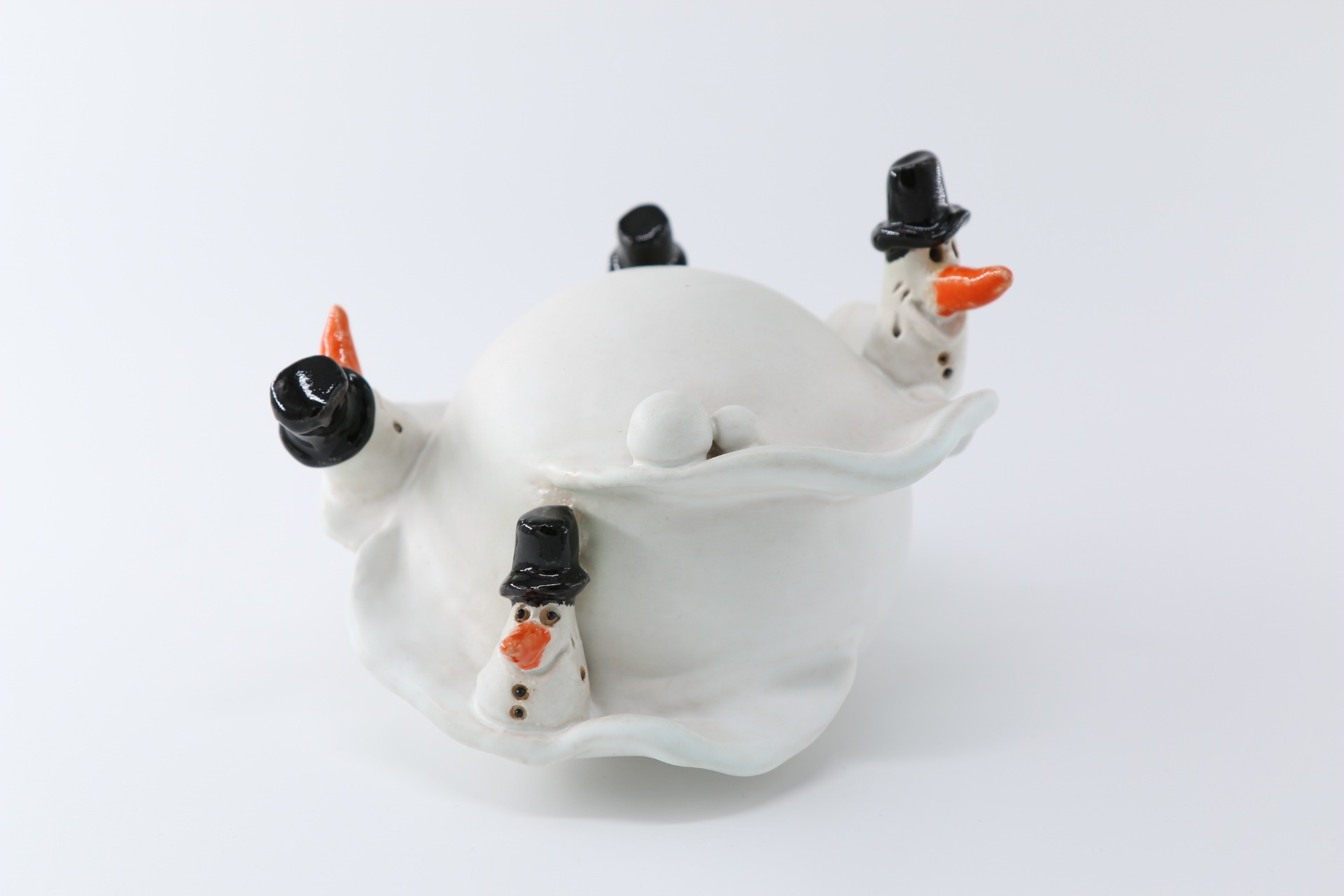 Bolvorm, gedecoreerd met een slingerend pad en spelende sneeuwmannetjes.Diameter ongeveer 15 cm.