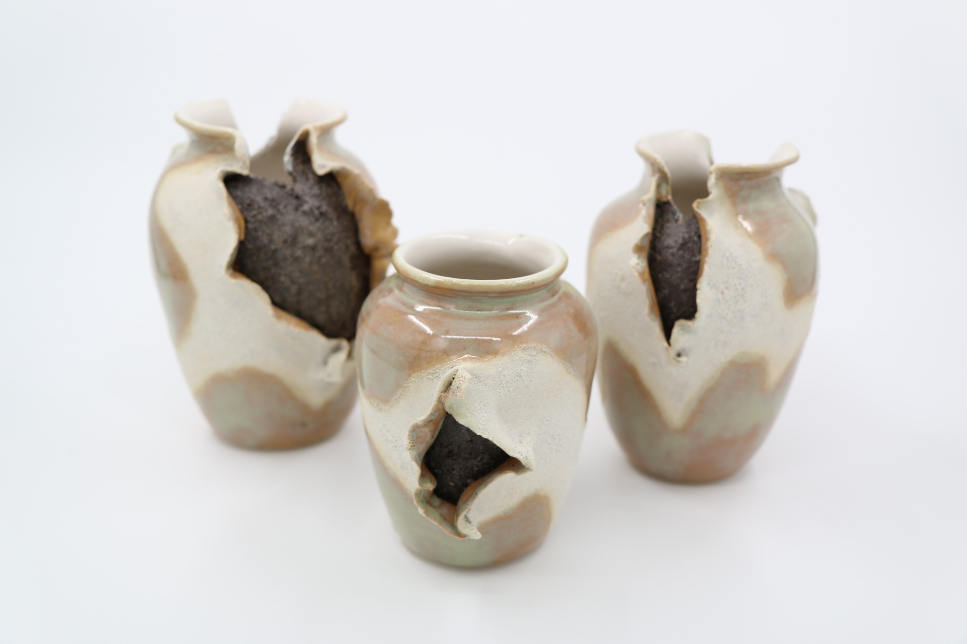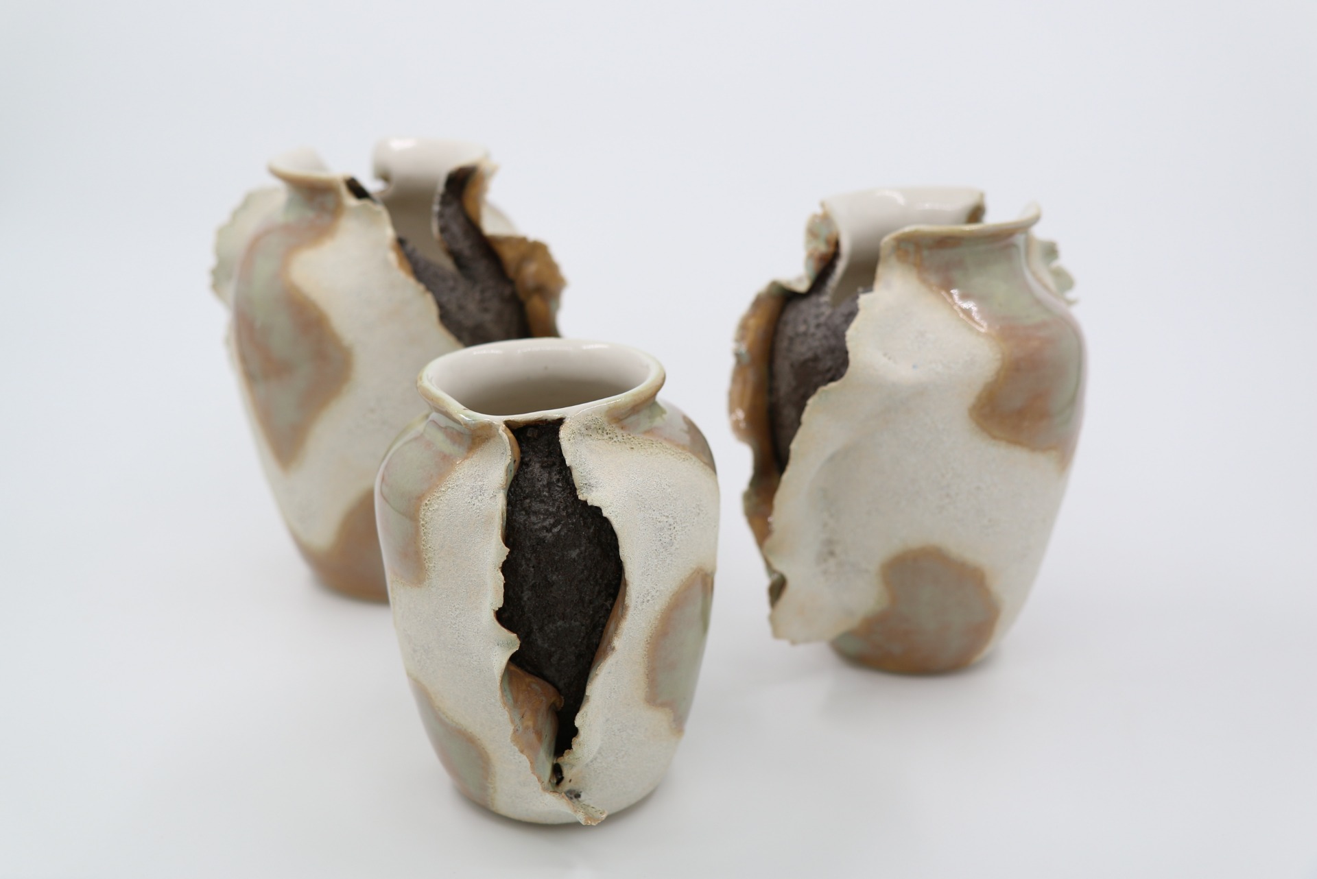 Set van drie decoratieve vazen "ExploSea" met golvende randen en structuurglazuur. Droom weg naar verre stranden bij deze maritieme beelden.